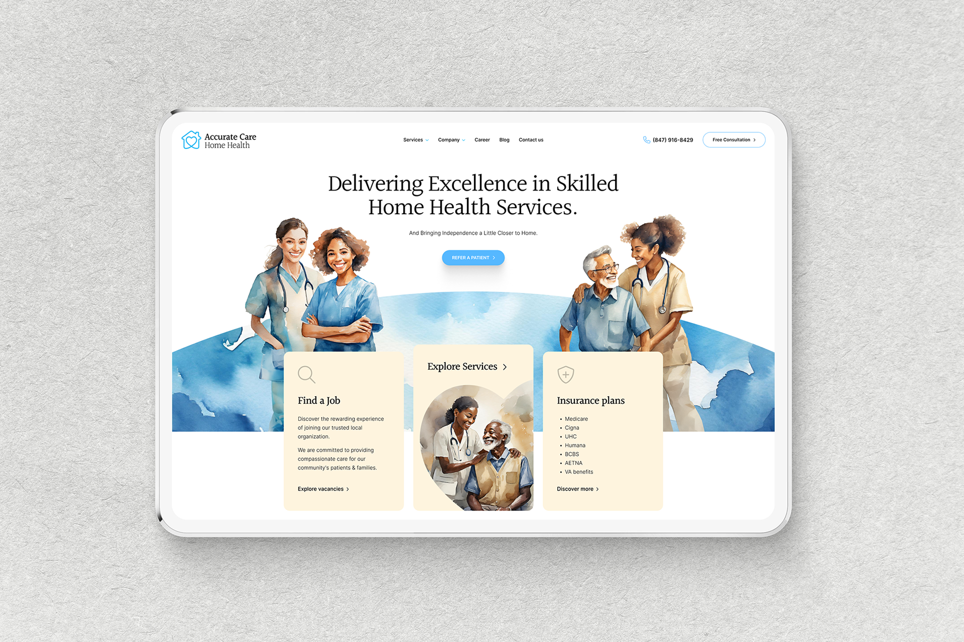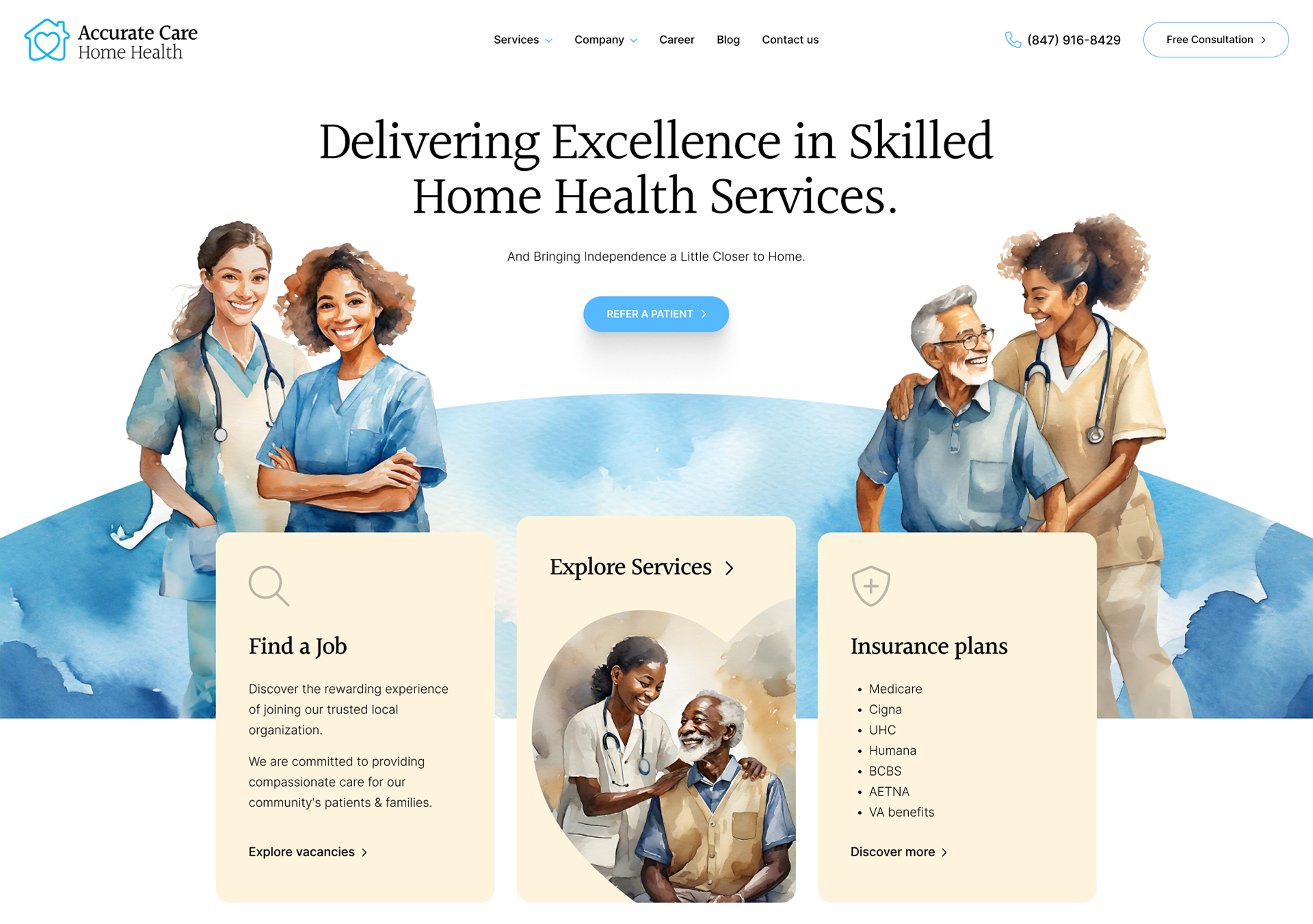 To redesign, modernize, and develop a warm, easy-to-navigate hospice website for a U.S.-based healthcare organization serving communities in Chicago and other cities across the United States. The primary objective was to replace an outdated interface with a visually distinctive, emotionally resonant design that clearly communicates Accurate Care’s compassionate mission while providing a seamless user experience. The redesigned site needed to make it simple for patients, families, and providers to find essential information, start referrals, and access resources—all while maintaining a balance between professionalism and empathy. Additionally, it was crucial to introduce a recognizable visual signature, built through custom AI-generated illustrations and thoughtful typography, that would distinguish Accurate Care from competitors and create a lasting impression aligned with the organization’s identity and purpose.